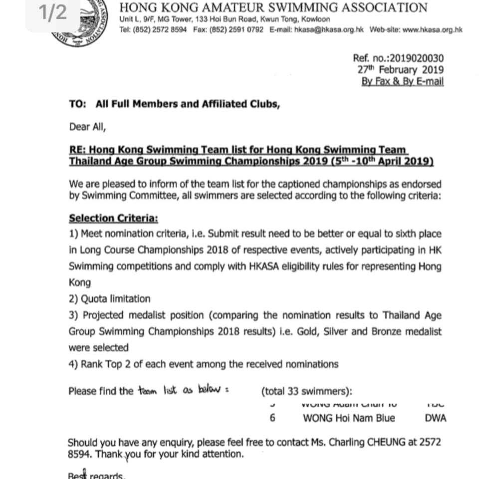 恭喜本會泳員王海藍,成功獲香港業餘游泳總會選拔,代表香港出戰泰國分齡游泳錦標賽2019,在此預祝王海藍在這次比賽游出自己的最佳時間為香港爭光.